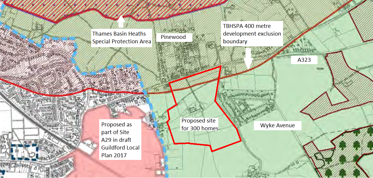 The site’s northern boundary and approx. one sixth of its land is within 400 metre TBHSPA development exclusion zone. The land is in the Green Belt and outside the settlement boundary. The potential for urban sprawl eastwards from Ash into Normandy ward is self-evident, with the proposed site removing 11.7 hectares of essential Green Belt.