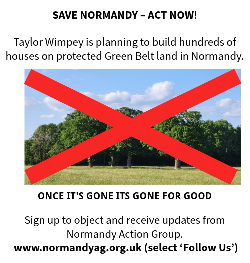 1. In its leaflet, distributed to households in Normandy Parish to announce its first ‘Public Consultation event’ on Friday, 18 July, and on its website, Taylor Wimpey (TW) states that its ‘Emerging Vision’ for its site at Normandy and Flexford includes: