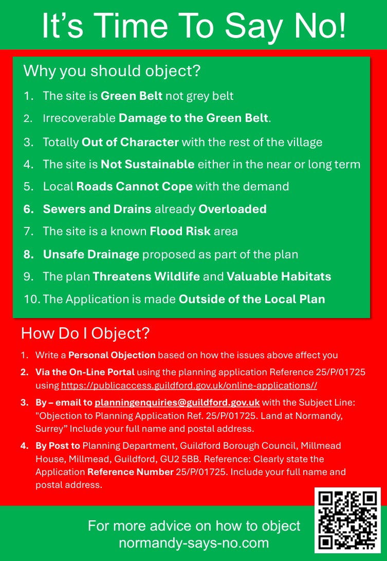 The Taylor Wimpey applications for up to 950 new builds on the Green Belt in Normandy, along with the associated one for 'Suitable Alternative Natural Greenspace' (SANG), have now been published on the Guildford Borough Council (GBC) website and are open for public consultation, under the references 25/P/01725 and 25/P/01726 respectively.